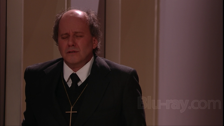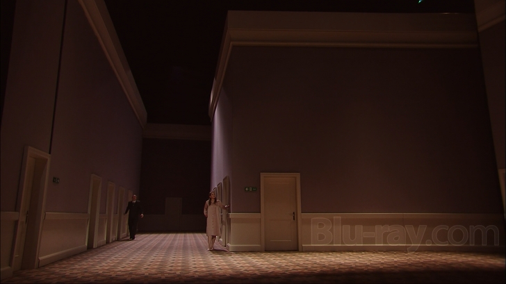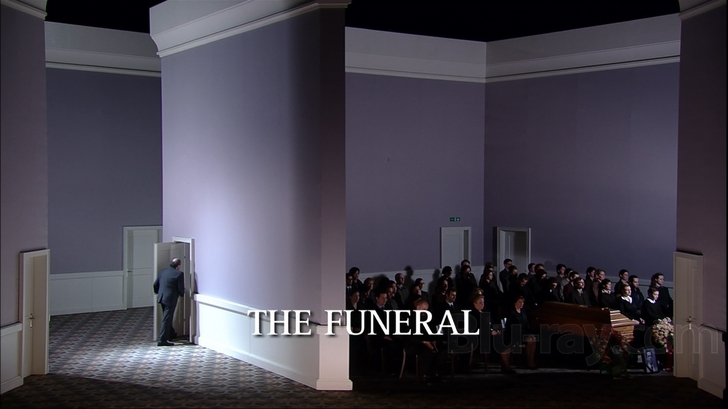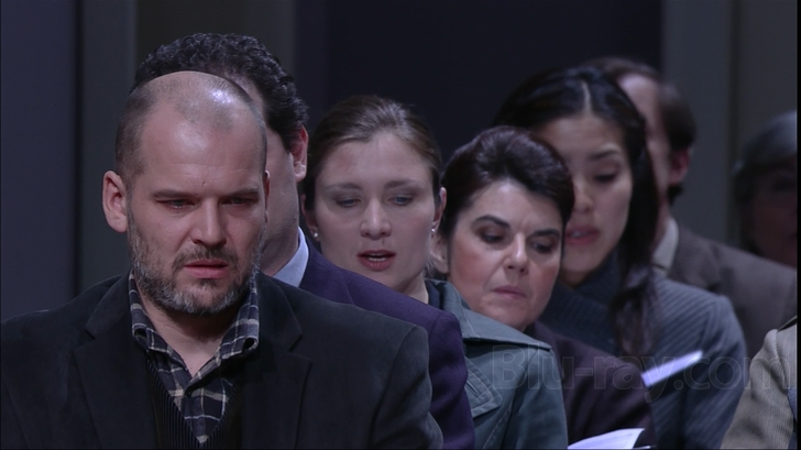 Messiah looks decently sharp with an AVC codec in 1080i and a 1.78:1 aspect ratio onthis Blu-ray offering from C Major and Unitel Classica. Colors are somewhat muted throughout, part of the intentional design of the piece, but detail is exceptional, to the point where you can see the latex makeup of the suicide victim's slit wrists (isn't that nice to know?). There are some minor artifacting issues in this interlaced video, notably some failure to resolve the patterns on the suitjackets of both the men and women. The entire production is just slightly bathed in a purplish hue, perhaps a reflection of the wall color in most of the sets. This does give the fleshtones a somewhat odd appearance at times. Overall, though, this is a very good looking production, if you can stand to look at it.