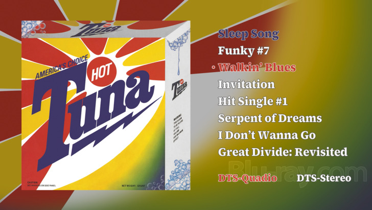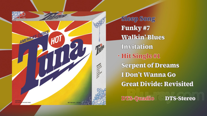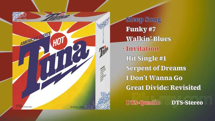 Hot Tuna: America's Choice features DTS-HD Master Audio 4.0 and DTS-HD Master Audio 2.0 options. The quad mix announces its separation proclivities from the get go, with the rhythm guitar placed forward and lead guitar rearward at the very opening of Sleep Song, and many of the subsequent tracks similarly splay the accompanying instruments around the soundstage. The riff driven ambience of several tunes can lead to all four channels emitting at least the riff material simultaneously, but even then there is some really appealing directionality, as in the placement of the bass in the rear speakers in Funky #7. The latest bunch of Quadio releases has rather interestingly really tended to feature a lot of engagement of the rear channels, and that's again the case with America's Choice, with, for example, the percussion instruments clearly placed rearward in Hit Single #1, among other tunes. The only niggling qualm some may have with the quad mix is that vocals tend to be buried in the instrumental masses at times.