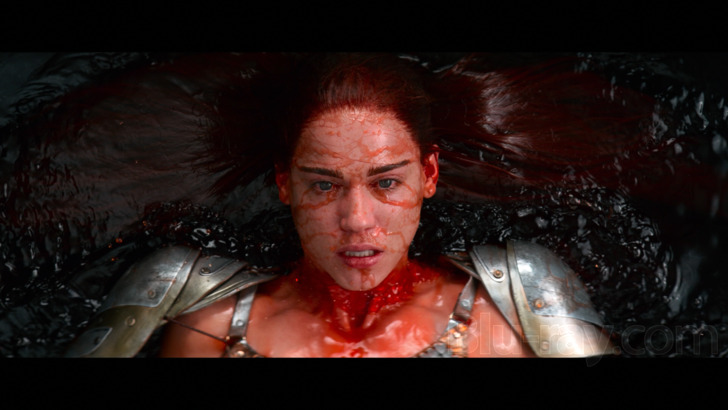 The image presentation (2.39:1 aspect ratio) for "Red Sonja" works with the very digital-like appearance of the picture. Detail is good, exploring the textures of the fantasy world, including heavy armor and weapons, along with wear and tear on the characters. Skin particulars are secured, and costuming is fibrous. Locations maintain depth, joined by CGI vistas, and interiors provide dimension as the story moves around caves and dungeons. Color is defined, including the pronounced red hair of the heroine. Creature additions carry appreciable hues, and cooler metallic looks are preserved. The whiteness of Annisia is also distinct. Greenery is alert. Skin tones are natural. Delineation is satisfactory. Mild banding is detected.