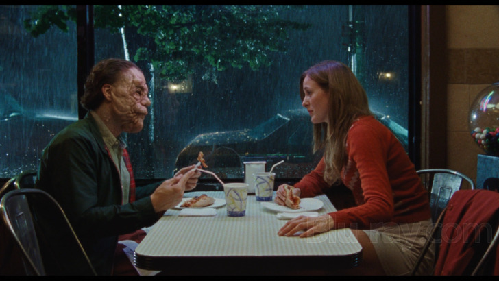 A Different Man is presented on Blu-ray courtesy of A24 with an AVC encoded 1080p transfer in 1.85:1. Schimberg mentions wanting to go for a "gritty New York" look for the film, and he has certainly achieved that with his deliberate choice of Super 16 (Kodak film was utilized). The result is appealingly organic, though the smaller format may admittedly not provide mind blowing fine detail levels in lower light situations and in some wider framings. That said, midrange to close-up shots have typically excellent detail levels on everything from the prosthetics Sebastian Stan wears as the "first" version of Edward (and even later when he puts on his mask), to more mundane items like textures on fabrics. There's a kind of "golden hour" color timing throughout this presentation irrespective of when and where certain scenes may be taking place. It sure looks to me like at least some of the brief interstitials of Edward doing the PSA may have been digitally captured (note the lack of grain and boosted clarity in screenshot 4 for an example).