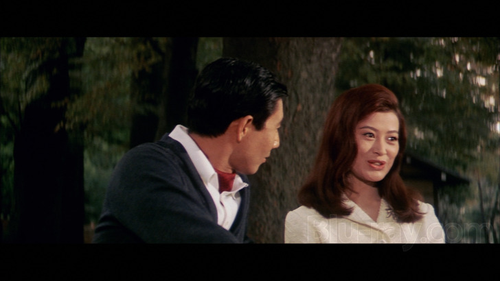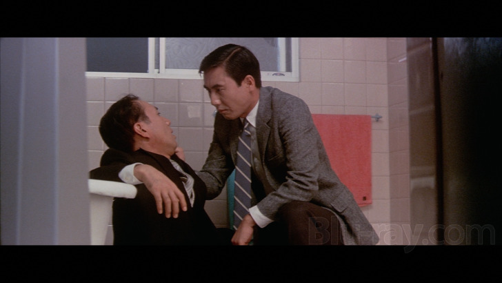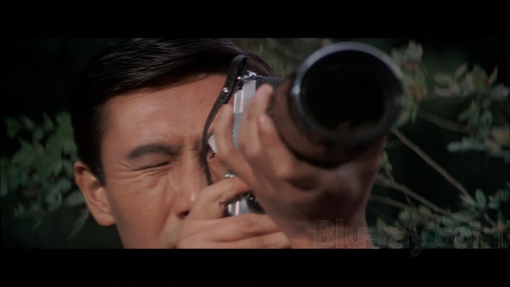 A Certain Killer and A Killer's Key are both presented in their original aspect ratio of 2.35:1 with mono audio. The high definition masters were provided by Kadokawa.I'm not sure if the somewhat odd aspect ratio of this transfer indicates some underlying issue, but I did occasionally feel like this could look a bit anamorphically stretched (see screenshot 5). There presentation probably has a slightly less consistent clarity than the first film, but on the plus side, the palette has less of the dowdy brown and faded appearance, and both bright primaries and more nuanced hues like flesh tones look natural. There may still be just a bit of a yellowish undertone at times that can make reds skew slightly toward oranges. The presentation may also strike some as too bright at times, with a somewhat milky overlay that can slightly work against solid contrast. Grain resolves naturally.
