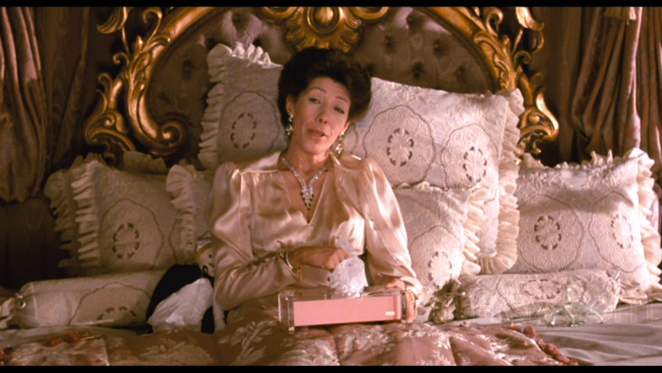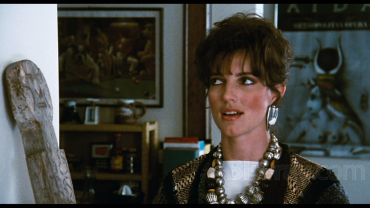 The production designs by Edward C. Carfagno (Time After Time, Pale Rider) impress in spades, too. The design efforts add comedic fun. The sensibilities of the production effort help the comedy to unfold.