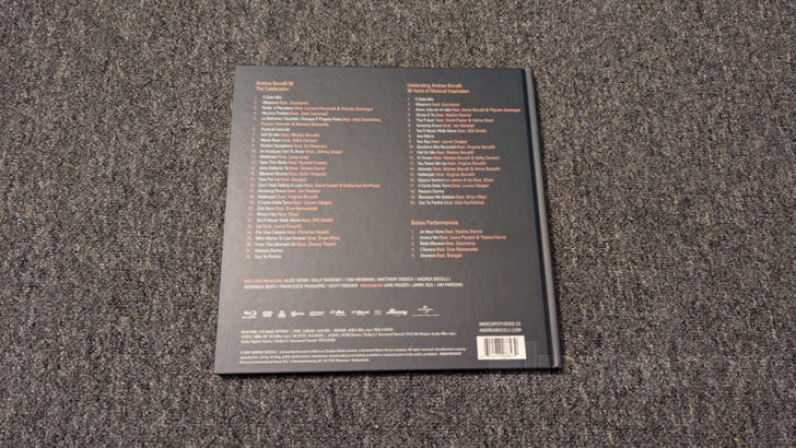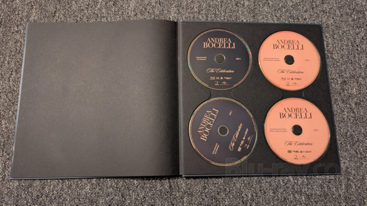 Mercury Studios has really gone to town helping Andrea Bocelli celebrate his 30th year in show business. Andrea Bocelli: The Celebration 30th Anniversary 4K offers two 4K discs in standard packaging, while Andrea Bocelli: The Celebration 30th Anniversary offers two 1080 discs in DigiBook packaging. This deluxe edition offers the same two 1080 discs as the DigiBook along with two DVDs, this time in a really extravagantly produced large hardback book. I'll link to my reviews of actual disc contents below from my original 1080 and 4K reviews, and will discuss aspects of the packaging below, but this review offers several hi res photos of this edition. Screenshots of the concert are available in the two other reviews linked to below.