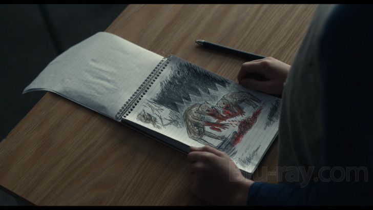 Antlers features an often impressively immersive DTS-HD Master Audio 5.1 track. While both the sound design and score tend to traffic in some pretty hoary tropes, including huge ominous swoops of low frequency sounds which can pan through the side and rear channels, there's a nicely nuanced attention to detail in ambient environmental effects placement. The film ping pongs between interior and exterior locations, and there's some really nicely detailed accountings of changes in things like ambient reverb. Dialogue is rendered cleanly and clearly throughout. Optional English, Spanish and French subtitles are available.