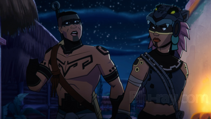 Enough about that, because it's much better to view Clash of Empires in its original Spanish... but sadly, WB has only included a secondary Dolby Digital 5.1 track encoded at a DVD-grade 448kpps bit rate. I understand not making it the default option, but not including a lossless track for the original language is an awful decision. It's doubly disappointing because this Spanish track runs laps around the English dub; not just because voices match mouth movements, but the Spanish voice acting cast does a far superior job of committing to their respective roles. (Jaguar Woman and The Joker are obvious standouts, but it's a clean sweep overall.) While this lossy track is by no means a total bust and does serve up crisp dialogue, well-prioritized surround activity, and occasionally deep LFE drops, I've got no choice but to dock the audio rating at least a full point on principle alone. While the studio's traditional catalog titles have thankfully taken great strides forward in the area of original audio tracks, the animation arm continues to struggle.