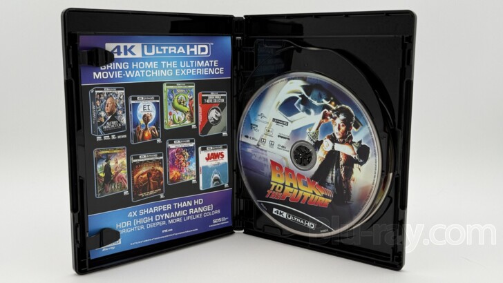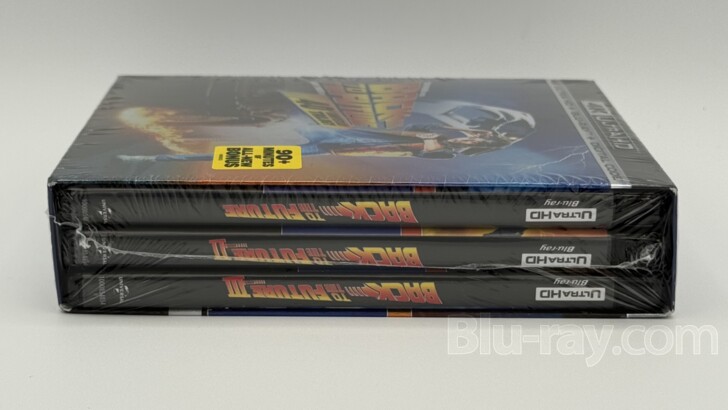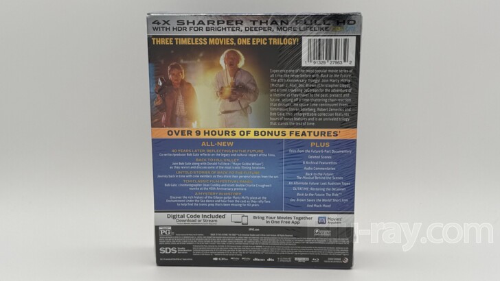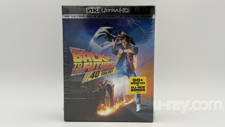 One of the most beloved film trilogies returns to 4K UHD disc in the 'Back to the Future: 40th Anniversary Trilogy 4K' courtesy of Universal. This new 8-disc set (3 4K UHD discs and 5 Blu-ray discs) includes all three films and over nine (9) hours of supplemental content, including a Blu-ray disc containing almost ninety minutes of new material. The films star Michael J. Fox as the time-travelling high-schooler Marty McFly, and Christopher Lloyd as inventor Doctor Emmett Brown, alongside actors such as Leah Thompson, Mary Steenburgen, and Elizabeth Shue. Please scroll down to the 'Special Features and Extras' section below for an accounting of the new disc of supplemental material. An embossed and foil-enhanced slipbox, and a Digital Code redeemable via Movies Anywhere are also included.
