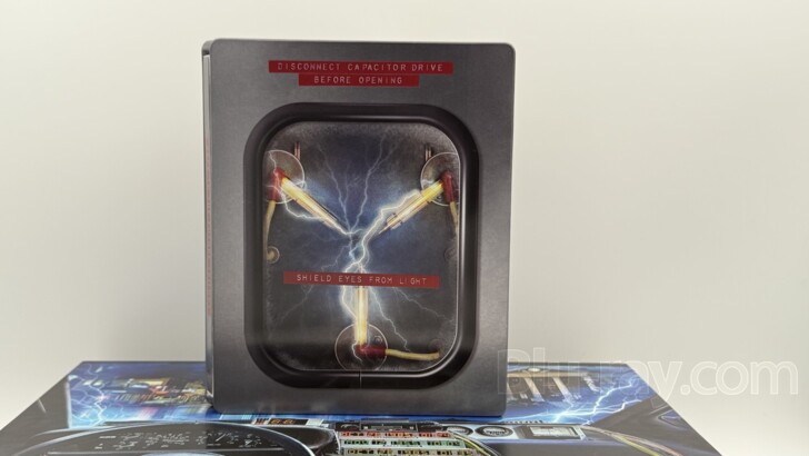 some, this is likely a dealbreaker. The cover of the SteelBook mimics the all-important Flux Capacitor, as energy visibly surges between the
