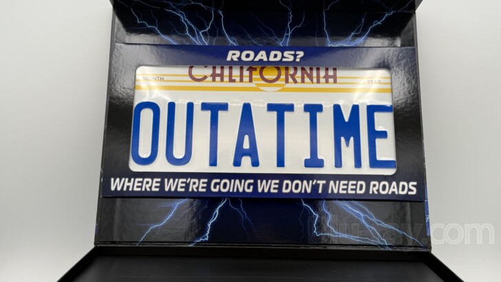 box's embossed and foil-enhanced cover (which is held shut by magnetic closures), the first item visible is the full-size replica license plate which is