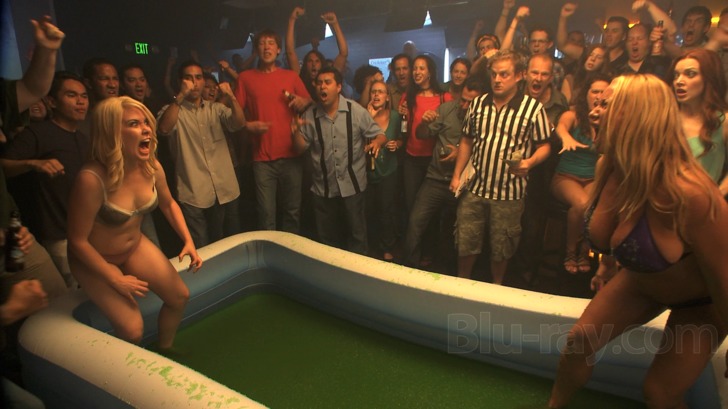 Best Night Ever was shot by Friedberg/Seltzer's usual cinematographer, Shawn Maurer (who also has other credits to his name, e.g. Black Dynamite ). To create the film's homemade video style, Maurer employed a variety of digital cameras, including the Canon AX10, the Panasonic GH2, the GoPro system and the Sony EX3. The four main cast members frequently served as operators, and editor Peck Prior (who also cut Bridesmaids ) had to construct sequences out of various angles to sustain the illusion that the whole thing had been recorded by Zoe's iPhone. The image on Magnolia Home Entertainment's 1080p, AVC-encoded Blu-ray looks far superior to the usual presentation of films made according to the "found video" aesthetic. It no doubt helps that every location in Las Vegas is brightly lit, so that the only sequence with a deliberate "night vision" style occurs in a dumpster (don't ask). And since iPhone cameras are generally top quality, no one seems to have felt the need to degrade the image to sustain the illusion of a video diary. Except in shots that are jerky or breaking up because the person holding the camera is running or falling, the image is generally sharp, and detail is exceptionally good, just slightly less than one would expect from a professional digital capture. Faces in crowds, the sights and sounds of Vegas and the increasingly disheveled state of the four leads are easy to spot. The color reproduction is also impressive; the filmmakers made the correct decision not to intensify the palette in post-production to bring out the glitz of Vegas, but to leave the hues at the level where an iPhone would be likely to record them. The blacks are somewhat underwhelming, but that is consistent with the source and its style. The average bitrate of 23.84 Mbps is a good compromise for this digital film, which has a lot of crazy motion and intentionally "unpredictable" breakup. Scenes like the lengthy sing-a-long (you'll know it when you see it) probably allowed the compressionist to conserve bits for more demanding sequences like the gelatin wrestling.