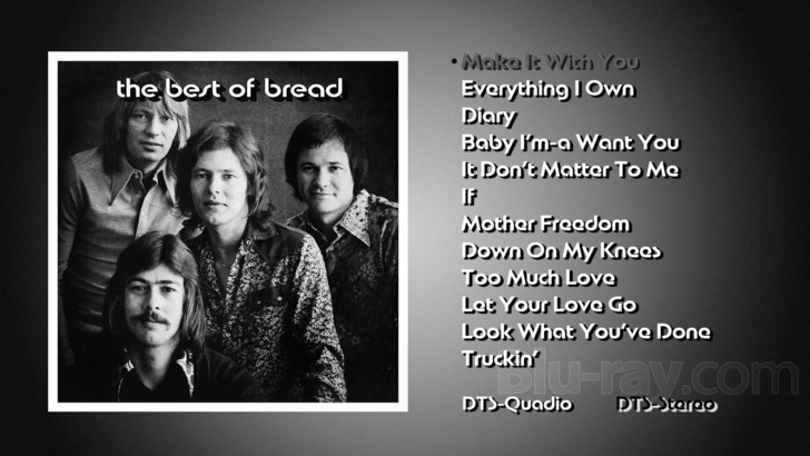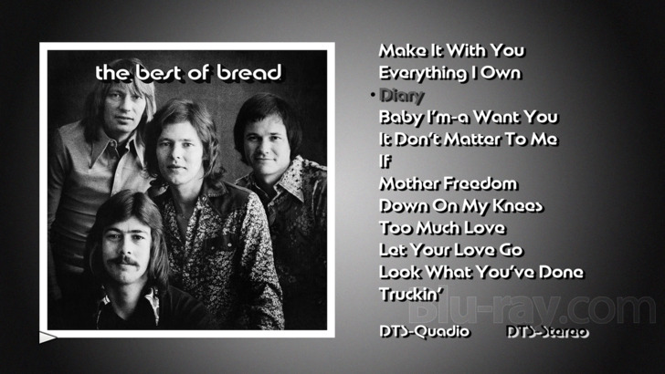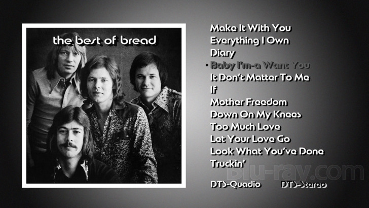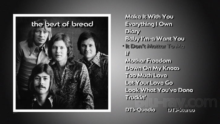 The Best of Bread features DTS-HD Master Audio 4.0 and DTS-HD Master Audio 2.0 options. Bread kind of broke the mold and/or the Dutch Oven by really not emphasizing hugely layered backups in their material, tending to favor David Gates' beautifully languid voice in the majority of their big hit tracks. Vocals are excellently prioritized here, but it's really the glimmering instrumental and orchestral accompaniment where the four channel presentation can really show off its most impressive activity. Various songs can anchor guitars either in the front or rear, with drums and bass "mirroring" them (i.e., if the guitars in the rear, other instruments tend to be forward, and vice versa). There's a really gorgeous fluidity to things which, yes, is almost relentlessly mellow, but which offers sterling fidelity and crystal clear reproduction. Somewhat as with Carly Simon: The Best of Carly Simon, which repeated tracks from the previously released Quadio version of Carly Simon: No Secrets, this album repeats some tracks off of Rhino's previously released Quadio version of Bread: Baby I'm-A Want You