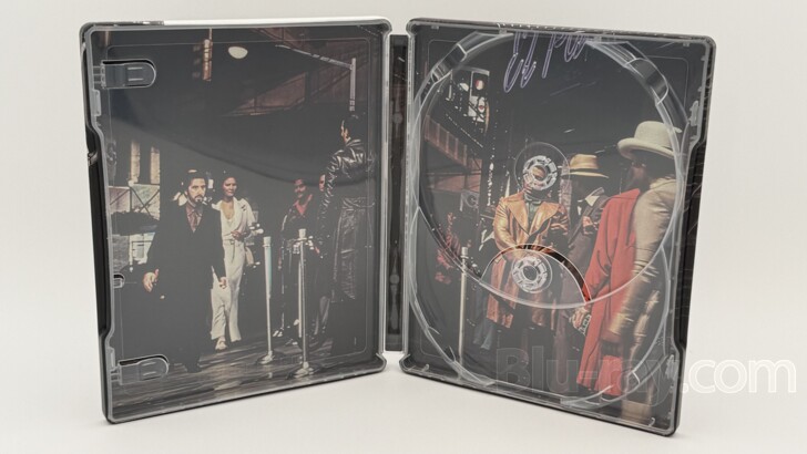 its own hub, with the 4K UHD disc on top. Removing all of the contents reveals a two panel image of from the film. It's a crowded exterior shot of