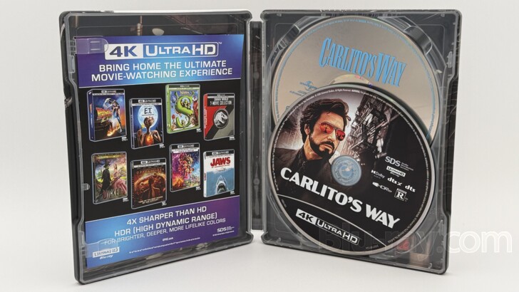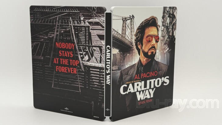 Brain De Palma's acclaimed 'Carlito's Way' returns to 4K UHD disc in the new 'Carlito's Way: Limited Edition SteelBook 4K' courtesy of Universal. The film stars Al Pacino ('Scarface (1983)') as the titular character who has been recently released from prison, Sean Penn ('This Must Be the Place'), Luis Guzman ('The Caller'), Penelope Ann Miller ('The Artist'), and Ingrid Rogers ('Bosch'). The 4K UHD disc included in this release is identical to the wide release from 2021. As such it includes a modest assortment of extras and a DTS:X audio track. A Blu-ray disc, and a Digital Code redeemable via Movies Anywhere are also included. For a discussion of this new SteelBook, please scroll down to the "Special Features and Extras" section.