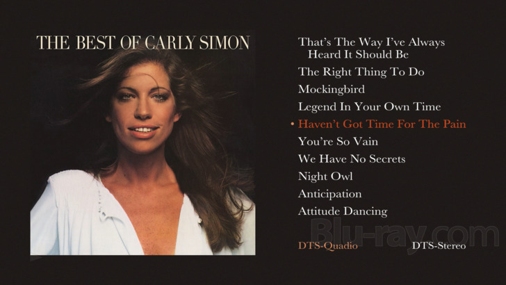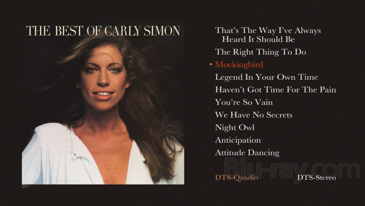 The Best of Carly Simon features DTS-HD Master Audio 4.0 and DTS-HD Master Audio 2.0 options. It might seem like a bit of a cheat in terms of this album offering four tracks from the previously released No Secrets, but the good news is the "new" tracks offered here all sound really beautifully spacious in their quadraphonic presentations. Even moody, quiet ballads like That's The Way I've Always Heard It Should Be really benefit from the surround repurposing, with Carly's plaintive voice front and center, and really evocative entrances in the rear channels by the high piano accents and drums in the rear channels (interestingly the actual chordal accompaniment on piano is also toward the front). More relatively boisterous tunes like Mockingbird and You're So Vain offer widely imaged instrumentation and some really appealingly clear sound reproduction. The vocal separation between Carly and James on Mockingbird is especially directional and enjoyable.