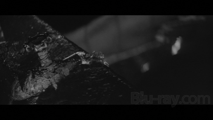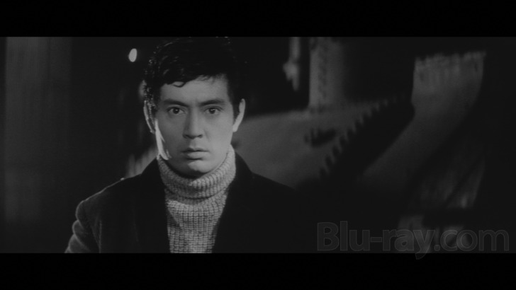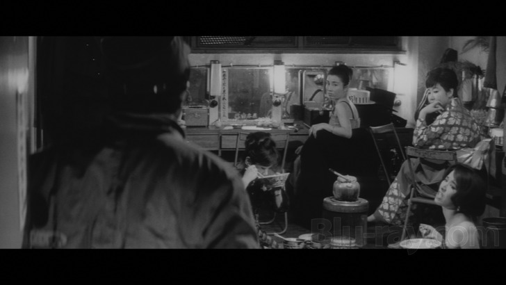 Cash Calls Hell is presented on Blu-ray courtesy of Film Movement with an AVC encoded 1080p transfer in 2.38:1. As usual, Film Movement doesn't provide much technical information on the transfer, offering only a generic "new digital restoration" in its insert booklet. This is an appealing looking presentation, but it shows recurrent signs of age related wear and tear pretty much from the get go during the Shochiku masthead and then continuing on. Numerous little flecks, speckling and scratches are discernable, probably exacerbated by the appealing chiaroscuro cinematography by Chu Sakai (Tadashi Sakai) which emphasizes blacks and darker tones, which can't help but make white flecks in particular stand out. Blacks actually can create their own minor passing issues, with some noticeable crush along the way (see screenshot 8). All of this said, there are still some appealing fine detail levels on things like costume fabrics, at least when lighting regimens allow. Grain is in evidence, but some of the lower light material looks like it may have undergone some kind of "grain management", since it can look pretty smooth at times.