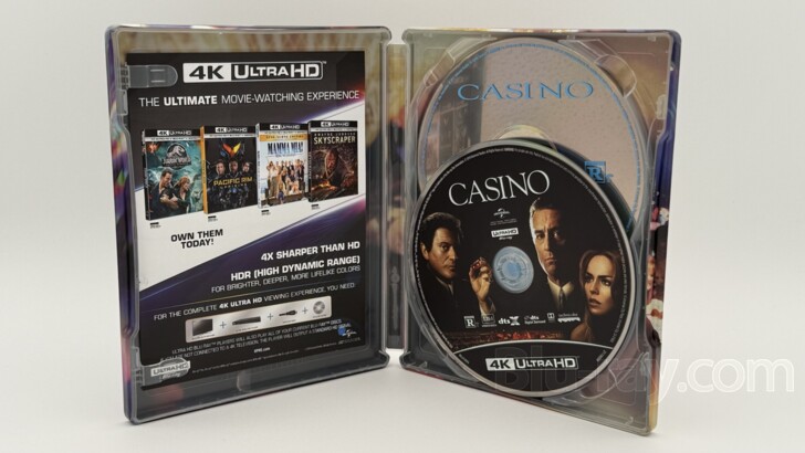 Universal brings one of Martin Scorsese's best back to 4K UHD disc with the 'Casino: 30th Anniversary Limited Edition SteelBook 4K'. The modern classic stars Robert DeNiro, Joe Pesci, and Sharon Stone in this fact-based tale of greed, corruption, and passion. The discs included in this release are identical to those found in the previous 4K release. The 4K disc features a pleasing 2160p transfer and an impressive DTS:X Master Audio track. All of the legacy features from the original 2008 release are again brought forward to this new release. A Digital Code redeemable via Movies Anywhere is also included. Please scroll down to the 'Special Features and Extras' section below for a discussion of the new SteelBook.