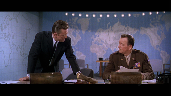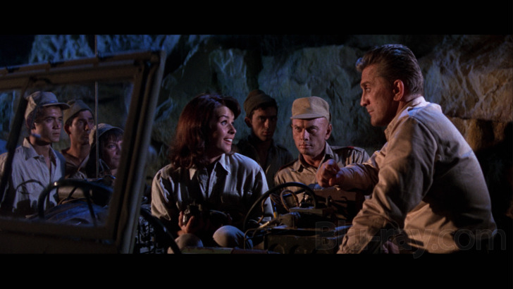 My colleague's 2014 review (of what very well may be the same transfer) awarded Kino Lorber's 1080p/AVC-encoded video transfer a 3.5, noting several issues. I can't say I disagree with those issues, mind you, just that my subjective impression of the presentation's positives more greatly outweighed its negatives, thus my 4.0 score. Yes, skintones are indeed sometimes a touch on the muddy end of the spectrum. And yes, several scenes suffer from lesser lighting (most notably a flashback to a battle that was filmed at early sunrise/late sunset) and lens choices that lead to lower clarity and duller contrast. But overall, Cast a Giant Shadow goes big and bold, with lovely colors, strong primaries, rich black levels and attractive contrast leveling. There's a depth and dimensionality to the image that lends it a handsome appearance, and enough fine detail to capture all the nuances of the film's costumes and production design. Edges are (largely) clean and refined (minus a handful that exhibit the remnants of some artificial sharpening), textures pop and delineation is quite good (when served in turn by the lighting and source quality). Speaking of, the source itself is in rather excellent condition, as there isn't any significant scratches, specks or blemishes to speak of. There are a few scenes that utilize era-limited compositing and rear projected backgrounds, and struggle accordingly, but they're definitely the exception rather than the rule. Likewise, there isn't any serious compression artifacting, blocking or banding on display, making for an impressive presentation.