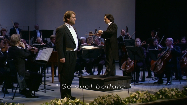 Once again PCM is the preferred codec for Opus Arte. On this disc you shall find a PCM 2.0 and PCM 5.1 tracks. I tested both and to be honest with you I prefer the 2.0 mix. For two reasons – it is somewhat better balanced and especially during the overture for Le nozze di Figaro the orchestra sound is more homogeneous. With the PCM 5.1 track the gap between the strings and the winds is far more obvious and some of the groups simply stick out. When the timpani enter the imbalance is even more noticeable. The good news is that on the PCM 2.0 mix unless trained to isolate the above orchestra groups you certainly won't be able to recognize what I described earlier. Thus, I feel strongly about recommending the PCM 2.0 mix as it preserves the "live" feel of this concert incredibly well and more or less maintains the balanced sound I believe is crucial here. Aside from that I did not detect any technical faults in either of the two tracks, they are both flawless. Optional English, French, and German subtitles are provided.
