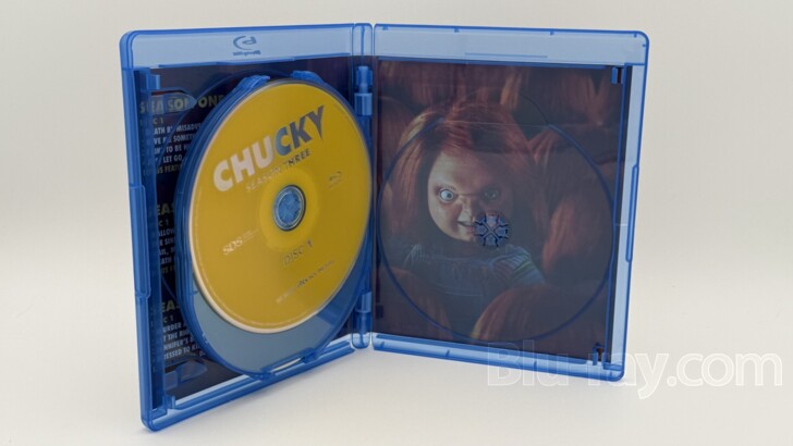 details the contents of each disc. The inner print hidden under the last disc of the third season is another ominous picture of Chucky.