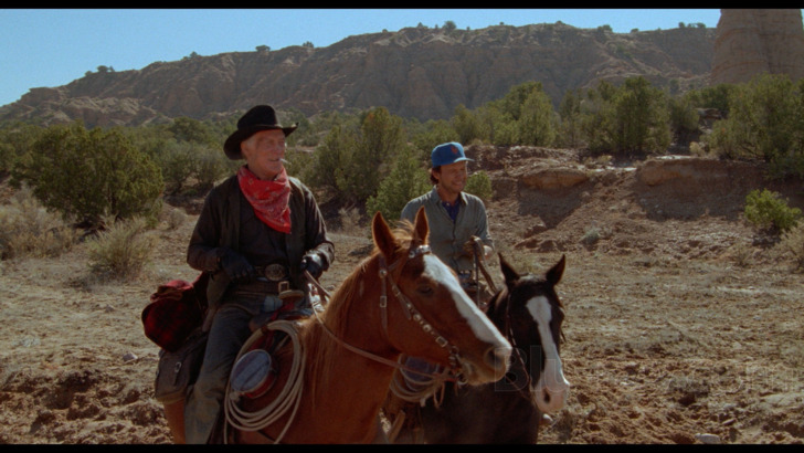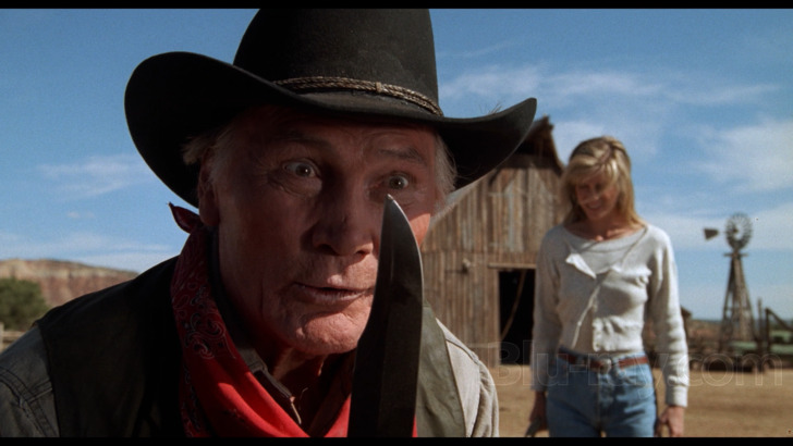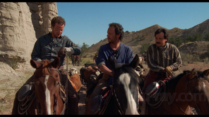 City Slickers is presented in its original 1.85:1 aspect ratio with original lossless stereo audio and DTS-HD MA 5.1 surround audio.As might be expected this resembles the Shout! Factory release more than the old Metro Goldwyn Mayer release, and that's a good thing, as comparing the color timing and clarity between the older MGM and newer Shout offerings shows the improvements the Shout! Factory release offered, and while both Michael and Brian gave almost tip top marks the video presentations of the discs they reviewed, my hunch is Michael probably would have downgraded his score had he had a comparison like the Shout! release to view at the time. In doing a cursory comparison of screenshots between this release and the ones Brian uploaded to accompany his review, it does look like this presentation is just a tad brighter than the Shout!, with an arguably more visible grain field on things like bright western skies. The palette is very healthy and nicely suffused. There are some definite ebbs and flows to the grain field in this presentation, and some relatively dimly lit material can look on the chunky yellow side. I didn't notice any of the evidently minor banding that Brian mentions in his review of the Shout! release.
