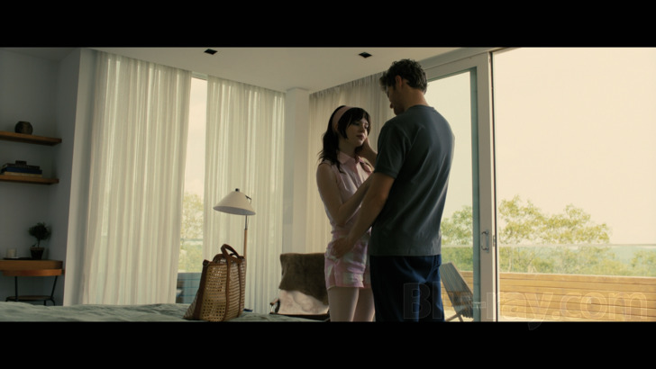 As usual, please see my separate 4K review for a general idea of Companion's visual aesthetic, which in this case pairs deep-focus cinematography with colors that seem bold and accurate without necessarily feeling "punchy" all the time. While I'll certainly give Warner Bros.' UHD the obvious edge in a head-to-head competition (after all, Companion is a native 4K production), the studio's Blu-ray edition respectably holds its own from start to finish. As seen in these direct-from-disc screenshots, it flirts with format boundaries by consistently offering crisp and well-defined visuals, accurate colors, and excellent fine detail during close-ups and wide shots alike. Disc encoding is quite good too, as Companion plays at a healthy bit rate on this dual-layered disc and doesn't suffer from visible compression issues such as banding, posterization, or macro blocking. It's fine work and a rare 5/5 Blu-ray for the studio (unless we're including Warner Archive), and for obvious reasons will be more than acceptable for those not yet equipped for the newer format.