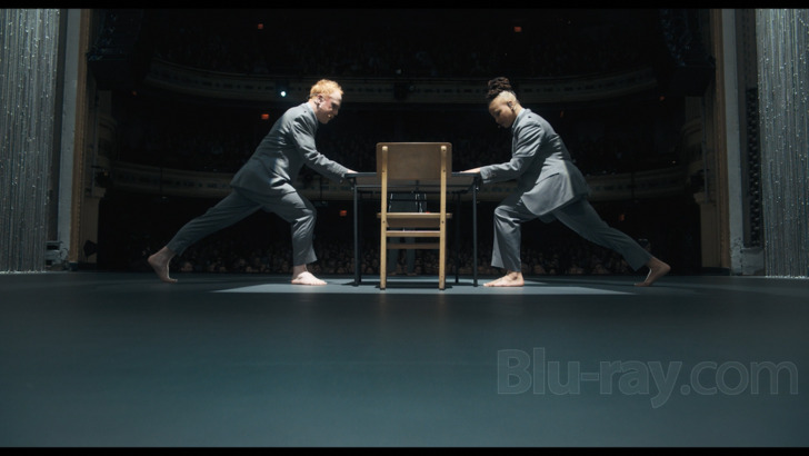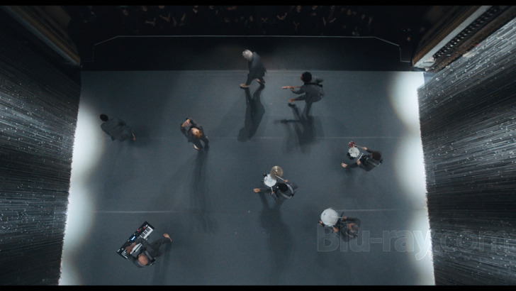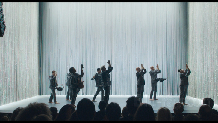 David Byrne's American Utopia is presented on Blu-ray courtesy of Criterion with an AVC encoded 1080p transfer in 1.85:1. Digitally captured with a variety of cameras and finished at 4K, this 1080 presentation is quite striking from both detail and palette perspectives, though it's probably the evocative stage lighting (not to mention the actual lights themselves) that will attract the most immediate attention. The palette is nicely vibrant, and some of the blue to teal tones especially expressive, and occasional interstitial moments of golden yellow can also be quite vivid. All of the performers are basically wearing the same kind of suits, but fine detail on the fabric is observable in close-ups when they're standing still (which frankly isn't all that often), and some of the detailing on the surrounding light curtain is surprisingly precise looking.