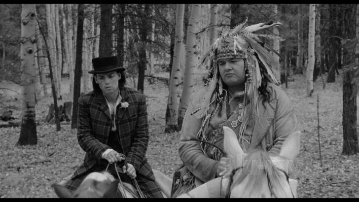 Bleeding and partially unconscious, Blake hides in the nearby forest, where he is lucky to be saved by a strange Indian warrior named Nobody (Gary Farmer) who might have spent too much time using the great peace pipe of his tribe. Meanwhile, after Dickinson is informed that the cold body of his son was discovered at the whore’s place, he hires a trio of kooky headhunters to track down Blake and bring him back to him -- preferably with a big gaping hole in his forehead.