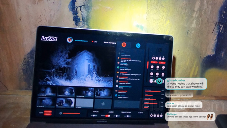 Deadstream is presented in its original 1.78:1 aspect ratio with DTS-HD Master Audio 5.1 sound. The high definition master was provided by AMC / Winterspectre Entertainment.The supplement with cinematographer Jared Cook discussing the cameras and lighting in some detail should be a "must see" for videophiles, but the bottom line is rather amazingly almost all of this "found footage" was captured with newer Go Pro models (somewhat hilariously, that "archival" video was actually captured with the much more advanced RED camera and then tweaked to look horrible). As even Cook mentions, there's some background noise that was evidently unavoidable given the low light situations, but otherwise this capture is remarkably solid, with excellent detail levels and a nice accounting of the palette. This looks identical to the Region A release, based on the unscientific method of screenshot comparison. There's some very brief banding noticeable during the RLJE masthead, but the main feature doesn't offer any severe compression issues.