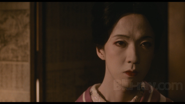 Demon Pond is presented in the aspect ratio of 1.85:1. Supervised and approved by director Masahiro Shinoda and actor Tamasaburo Bando, this 4K restoration was undertaken by Shochiku and Imagica Entertainment Media Services, Inc., from the 35 mm original camera negative. The original monaural soundtrack was remastered from the 35 mm original soundtrack negative by Shochiku MediaWorX Inc.Kind of amazingly considering the expressive cinematography of Masao Kosugi and Noritaka Sakamoto, for some reason this 4K version does not offer any HDR grades, and my hunch is that will be the biggest stumbling block for some. I won't spend a lot of time wondering "what if", other than to say the imagery here is so suffused with a variety of both warmer hues like golds and oranges and cooler tones like blues and greens, not to mention a glut of rather dimly lit vignettes, that I can't help but think HDR could have aided and abetted things measurably. As it stands, this is quite similar to the 1080 presentation in terms of palette reproduction, while the increased resolution may have both benefits and detriments. On the plus side, fine detail levels can see at least marginal improvements on things like costumes and even foliage, at least in better lit moments. On the minus side, and I'd personally say this may in fact outweigh the positive side, the film has so many composited opticals which add to an already thick grain field, that the 4K presentation can often feel like (to joke about one of the principal settings) it's underwater (or at least under significant amounts of grain) even when it's not. There's also some noticeable age related wear and tear in the early going in particular, including pretty bad image instability during the credits.