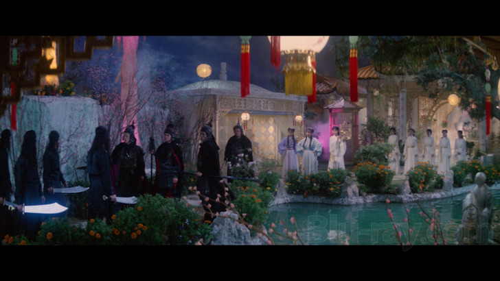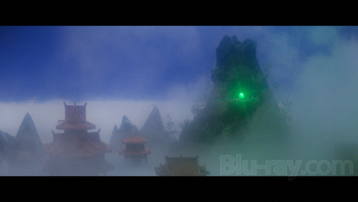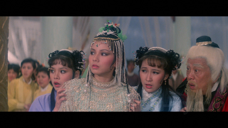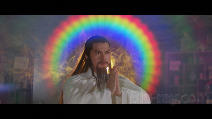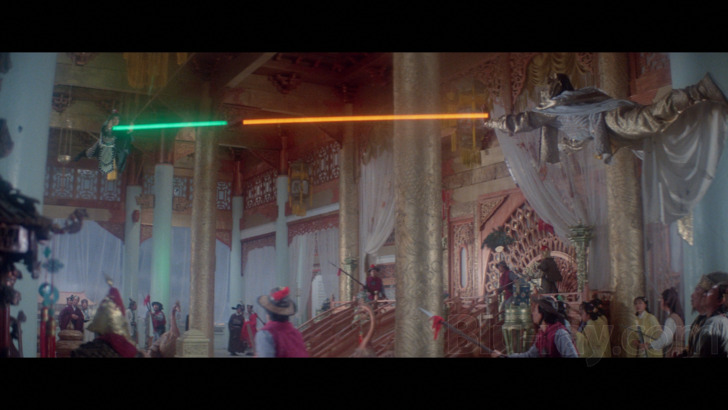 The image presentation (2.39:1 aspect ratio) for "Descendant of the Sun" is listed as "newly scanned and restored by Vinegar Syndrome in 2K from its 35mm original camera negative." An information card also details some editorial tightening to remove "visible splices," and labels this version "the longest ever on video and is presented with its proper theatrical framing intact." Color is the big draw here, and registers vibrantly with fantasy battles filled with light shows and lighting effects. There's a rainbow look to the feature, which remains secure, finding rich primaries along the way. Costuming also delivers bold hues, capturing pinks and golds, and blood reds remain distinct. Detail works through a lot of process shots and smoked sets, but skin particulars are strong, examining makeup additions. Extravagant costuming is fibrous. Sets are textured, also maintaining compelling depth. Interiors are dimensional. Delineation is satisfactory. Grain is nicely resolved. Source is in good condition.