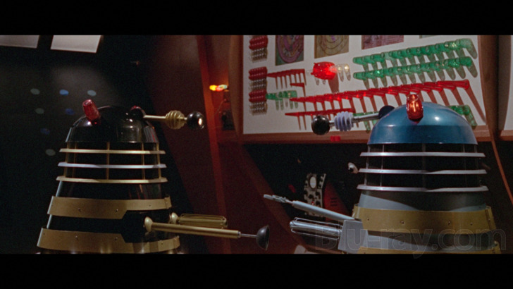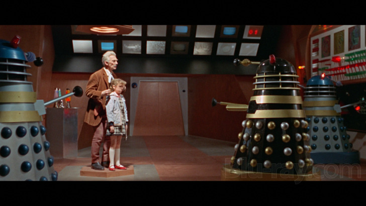 Dr. Who and the Daleks features a DTS-HD Master Audio 2.0 Mono track that is inherently narrow, but which delivers the often goofy sound effects and scoring choices without any issues. The score is mentioned in some supplements and will certainly strike those used only to the television series as distinctly different, but both traditional orchestration and electronic instruments are supported here with fine fidelity. Dialogue is rendered cleanly and clearly throughout. Optional English subtitles are available.