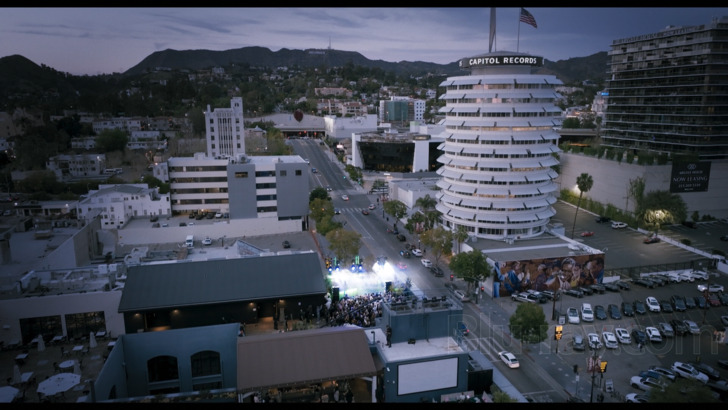 There may just a bit of a bait and switch with regard to Duran Duran: A Hollywood High, but my hunch is I doubt very few fans of the band are going to mind at all. Billed as a "feature length docu-concert" on the back cover, descriptive verbiage goes on to talk about how this piece "brings to life Duran Duran's deep and lasting relationship with Los Angeles", in what certainly sounds more like the docu side of things. And in fact the first section of this piece is a kind of sweet and drama free version of Behind the Music featuring various band members discussing their first visit to Los Angeles, and later visits which included them getting their star on the Hollywood Walk of Fame. But what initially seems to be some comments about the iconic Capitol Records building in Los Angeles then suddenly just kind of takes a veritable left turn and suddenly the rest of the piece is a live concert by the boys, delivered on the rooftop across the street from the round skyscraper so that it's omnipresent in the background. Kind of interestingly in terms of marketing and/or cover verbiage, the disc sent to me has a cover that does not have "Live in Los Angeles" under the band's name as is displayed above, which perhaps only further subliminally emphasizes the documentary aspect over the concert element.