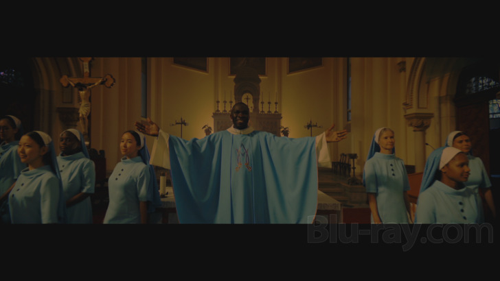 Dust Bunny features a fun Dolby Atmos track. The film has a lot of sonic activity courtesy of what amounts to a "road trip" of sorts for the two focal characters, and some of the crowded "urban" environments provide good surround activity. ShyBoy and Mark Nubar provide some source cues and an enjoyable ABBA tune accompanies the closing, all of which sound great. A song and dance in a church also has some engagement of the side and rear channels. Still, I'd rate this is a perhaps unexpectedly front and center anchored Atmos track, especially in terms of some of the dialogue scenes. That dialogue is always rendered cleanly and clearly. Optional English and Spanish subtitles are available.