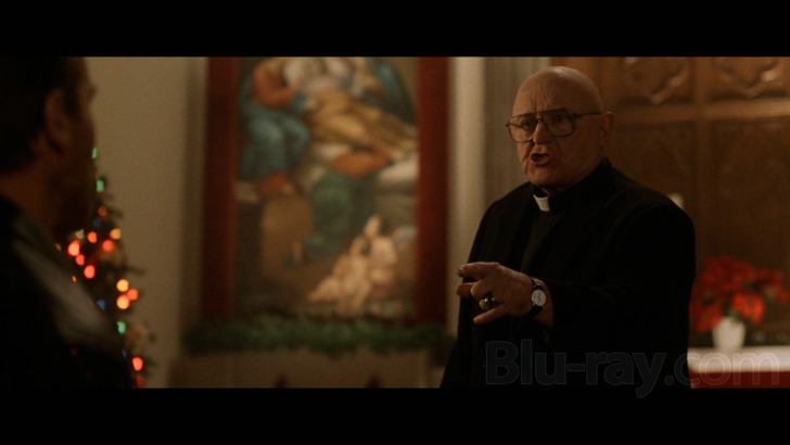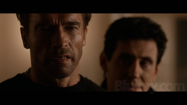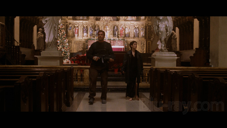 I own Universal's "Collector's Edition" DVD from 2000 which I have compared to Scream's discs. I will discuss the transfers in context with content from a long and comprehensive article Kevin H. Martin wrote on End of Days in the April 2000 issue of CineFex. Martin interviewed visual effects art director Ian Hunter, who lent insights into the shooting style of Hyams, who also served as DP. According to Hunter, Hyams favored heavy backlighting which you can see in a lot of the darker scenes. You may notice halo-like blooming of the highlights, which was intentional on Hyams's part. Indeed for a couple of the film's most fiery sequences, subway sequence supervisor Cheryl Budgett and cathedral sequence supervisor Edwin Rivera produced many blooming highlights on their fire shots to generate a type of lens fog over the whole composite. Even though Hyams used low-contrast filters, visual effects supervisor Eric Durst noted that the cinematographer kept contrast levels high by adding "deep shadow areas." Marty observed an occasional loss of shadow detail in the Universal transfer but fortunately shadow details is preserved on Scream's two transfers, especially the 4K.