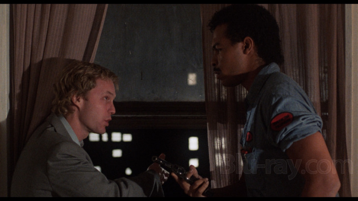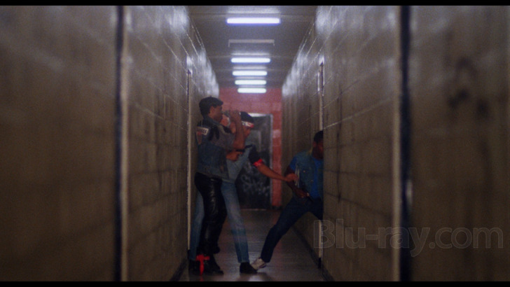 Enemy Territory is presented in its original 1.85:1 aspect ratio with stereo audio.While this was lensed by the legendary Ernest Dickerson (on hand in a really interesting interview included as a supplement), this was a low budget effort from Charles Band's Empire Pictures, and needs to be appreciated within that context. There's a gritty quality to the visuals that the transfer preserves, and that can include sometimes rather heavy grain that's especially noticeable against some of the brighter backgrounds, like the incessantly florescent lighting in the project's hallways. The palette generally pops extremely well, with good accountings of blues and reds in particular. Clarity and fine detail levels are a bit more variable and dependent both upon framings and lighting conditions. Some minor signs of age related wear and tear have made it through the restoration gauntlet.