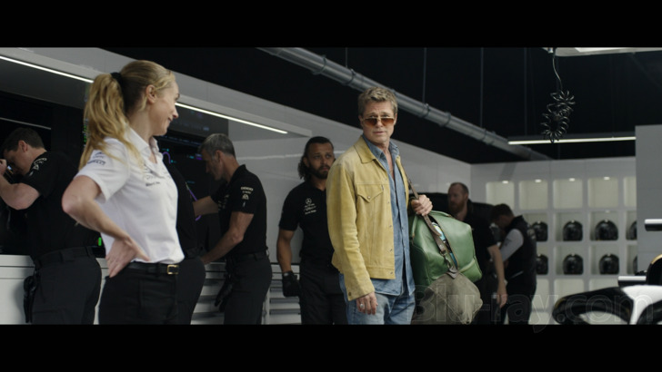 The technically proficient F1 unsurprisingly shines in UHD, and this nicely-appointed 2160p/HDR10/Dolby Vision transfer allows home viewers to bask in the film's native 4K visual delights. In short, it looks like a million bucks here with rock-solid image detail, day or night, with excellent color reproduction seen on bold primaries and banding-free gradients that show off glossy paint jobs, glowing brake rotors, pinpoint hues in wide establishing shots, and post or mid-race fireworks displays. Textures aren't far behind either as seem on clothing, close-ups, and background details including sand, gravel, and smoothly-paved tracks. The almost sterile white ApexGP garage and its fluorescent lighting looks squeaky clean and stands in comparison to more warmly-lit interiors such as VIP suites, luxury hotel rooms, and a restaurant where three team players have an impromptu meeting. Overall, this is a carefully controlled presentation that exemplifies the strengths of UHD and plays without a hitch on this triple-layered disc, maintaining a high and supportive bit rate that displays absolutely no compression-related issues from start to finish.