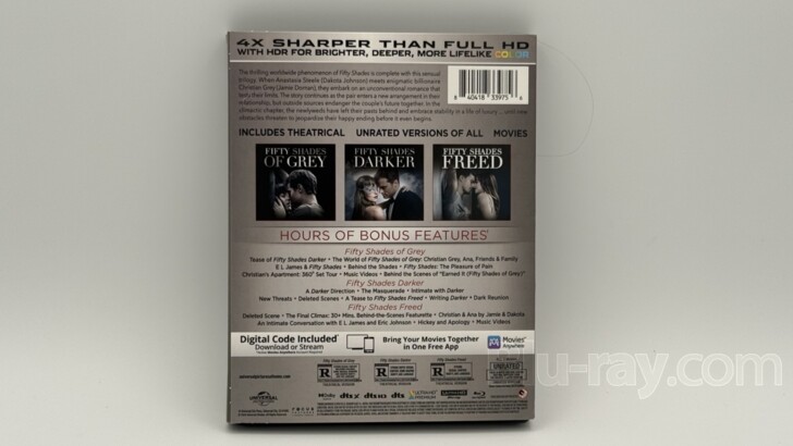 Initially popular with movie-goers during their theatrical releases, only time will tell if any or all of these films have the staying power to join the ranks of the classics of erotic cinema. They are, though, somewhat set apart and made unique by their BDSM focus. Dakota Johnson and Jamie Dornan are certainly well-cast from a physical perspective even if their acting skills aren't exactly up to snuff. Still, the films do have a certain charm and look (and sound) quite good in 4K. For fans of the books and/or the series of films who have yet to add them to their libraries, Universal's Fifty Shades: 3-Movie Collection 4K comes recommended.