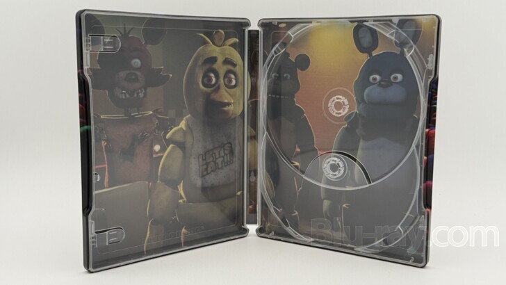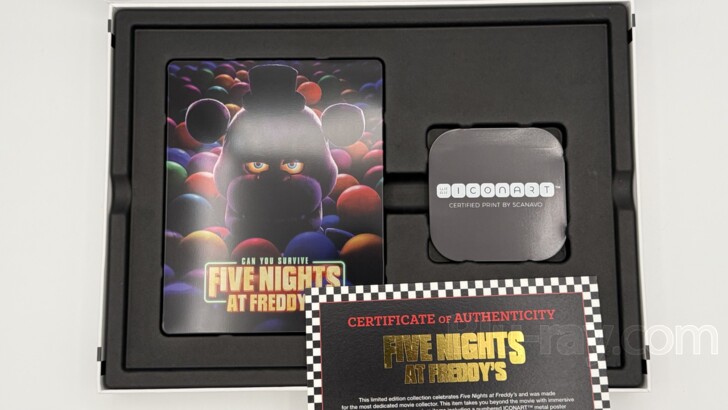 Measuring approximately 13" x 9.75" x 1.5", the Five Nights at Freddy's: Amazon-Exclusive Ultimate Collector's Series 4K box is quite sizeable, and is made to resemble a pizza box from the establishment. It efficiently houses the included content with little wasted space, it's size and dimensions are largely driven by the size of the metal poster. A tab closure keeps the lid secure. Opening the box reveals the the question "Can You Survive?" printed on the underside of the cover in large black letters. The metal poster in it's protective sleeve lies on top of the box's other contents. The metal poster is just slightly smaller the than the dimensions of the outer box, and has the same glossy finish as the SteelBook. The poster has a large image of Freddy, Foxy, Bonny, Chica, and Mr. Cupcake above a graphic the reads "Freddy Fazbear's Pizza Place". The glossy finish helps the colors pop nicely. On the right is the hanging solution for the metal poster. It consists of an adhesive square that is affixed to a magnet which is then positioned and stuck to the desired surface - most likely a wall. The metal poster is then held firmly on the wall by the magnet. Those with other releases from this line can switch between posters with ease as a result. Under the Certificate of Authenticity is the new SteelBook that sports a glossy finish. On the cover, Freddy emerges from the colorful depths of a ball pit. The image is dark and sinister. The simple black spine holds the film's title in its typical font in the center, and Universal's logo at the bottom. The back cover features Foxy, Bonny, Chica, and Mr. Cupcake also eerily rising up from the below surface of the ball pit. It is similarly dimly lit. Universal and Blumhouse's logos are found in the lower left corner, and a product number is found in the lower right. Opening the SteelBook, the Digital Code rests under the two tabs on the left side. On the right side, the 4K UHD disc and the Blu-ray disc are stagger- stacked, each on its own hub, with the 4K UHD disc on top. Removing the discs and the Digital Code reveals a two-panel image of the lethal animatronic robots. The glossy SteelBook does not have any embossed or debossed elements, but I personally find it preferrable to the previous SteelBook.