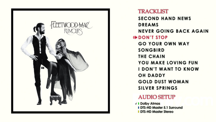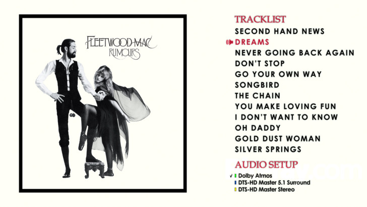 Fleetwood Mac: Rumours features DTS-HD Master Audio 2.0, DTS-HD Master Audio 5.1 and Dolby Atmos options. You can't really go wrong with any of these, but this is another example where I personally actually preferred the DTS-HD Master Audio 5.1 to the Dolby Atmos track for a surround presentation. The DTS-HD Master Audio 5.1 is noticeably less diffused and I'd actually argue just flat out louder overall than the Atmos mix, and it has to my ears a much more lively midrange and low end. One way or the other both surround tracks provide some interesting new listening experiences. Some "traditional" imaging, or at least discrete channelization, is noticeable from the get go with the very first seconds of "Second Hand News" emanating from the front left channel before total engagement is realized. Quite often but not always vocals are placed in the front channels, with the side and rear channels left to supporting instruments, with drums often featured in the rear channels. There are interesting uses of the rear channels for vocals, though, as on "The Chain". Fidelity is excellent and both vocals and instrumental forces are offered with sterling reproduction.
