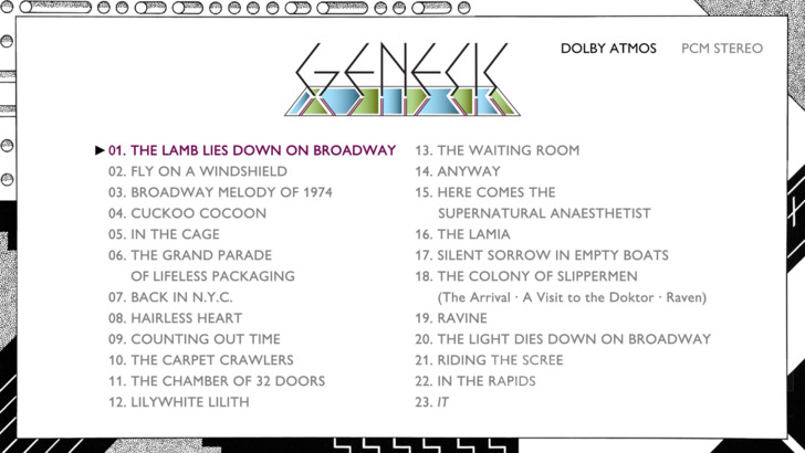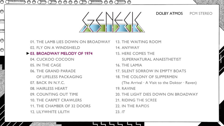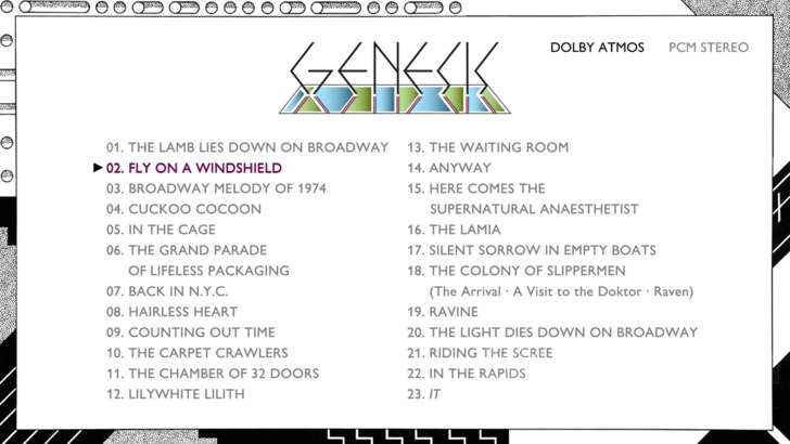 The Lamb Lies Down on Broadway features Dolby Atmos and LPCM 2.0 options. The enclosed booklet and/or Rhino's website credit the Atmos mix to Bob Mackenzie, overseen by Peter Gabriel and Tony Banks, at Real World Studios. The studio album stereo mix (96/24) is credited to Miles Showell with assistance from Nick Davis at Abbey Road Studios (some "fine print" on the loose back sheet on the release says Showell's efforts are 2025 remasters). I frankly didn't spend a ton of time with the stereo version, but it offers secure fidelity and some nice two channel separation. The Atmos mix announces its immersive capabilities from the get go, with that kind of toy piano opening encircling the listener in an almost round robin way (i.e., you can hear the sound literally circling around you). There are a ton of standout moments sprinkled throughout the album in terms of really nice separation and discrete channelization. The weird calls ending "In the Cage" emanate from the rear speakers, and conversely some of the spacy synth noises in "The Waiting Room" waft in from the front and Atmos speakers. Quite often vocals tend to be splayed evenly between the front and rear channels. There's some peculiar if slight distortion in "The Grand Parade of Lifeless Packaging" from some of the vocals emanating from the right side.