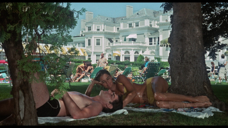 The image presentation (1.85:1 aspect ratio) for "Goodbye, Columbus" is listed as "remastered from a new 4K scan of the film's original 35mm camera negative." The viewing experience remains invitingly film-like, retaining decently resolved grain. Some mild elements of damage are encountered, including light scratches. Detail is acceptable, handling skin particulars on the actors, picking up on beads of sweat and hairstyles. Clothing choices are passably fibrous with period style. Interiors retain depth, exploring cavernous mansions and library rooms. Exteriors deliver compelling depth, highlighting community activity during celebrations. Color is secure, with vivid primaries on decorative additions and personal style from the era. Greenery and pool blues are distinct. Skin tones are natural. Delineation is satisfactory.