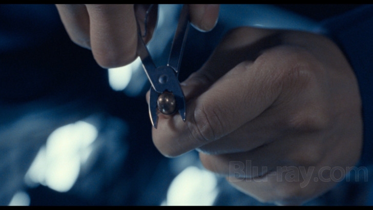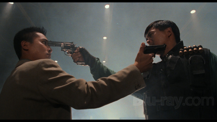 Hard Boiled is presented in its original aspect ratio of 1.85:1 with Cantonese and English mono audio and a new Cantonese Dolby Atmos mix. The film has been restored in 4K resolution and graded in HDR10 and Dolby Vision.While the Shout! Studios masthead at the opening of this film might suggest this is a carbon copy of that label's release, as James White has shared, Arrow once again did extra work on the master they were provided. While Stephen Larson gave top marks to Shout!'s release, there have been some pretty vocal and more decidedly negative reactions from longtime fans of the film, specifically decrying what they feel is a too warm accounting of the film's often ice cold blue tinged palette. As White has shared with yours truly, while Shout! is to be commended for its epic work delivering Golden Princess restorations in record time, Arrow has the luxury of more time, and in this particular instance (to quote White directly), "we felt it was important to entirely re-grade the film to match the historic references that we were familiar with. The colour grading that Shout! did for their release relied on different references that didn't match our own experience in viewing the film on 35mm in the 1990s". While I'm never one to rely completely on my memories of having seen theatrical exhibitions, especially as long ago as I saw this film in a theater, the cooler ambience on display in Arrow's release aligns with those memories. I'll once again cut to the chase and recommend those with the appropriate equipment to opt for Arrow's standalone 4K UHD release, as the HDR and Dolby Vision grades can offer some significant palette highlights, but even this 1080 SDR version offers blue graded material resonating beautifully here. That can include not just the overtly blue graded scenes, but even some elements of the production design, as in the colors of background sets. While once again improvements can be spotted in Arrow's 4K version, detail levels are frequently astounding, as in some extreme close-ups (even with skewed lenses and the like) that can offer precise looks at things like faces or hands. Grain resolves tightly for the most part, and never tips over into noisiness.