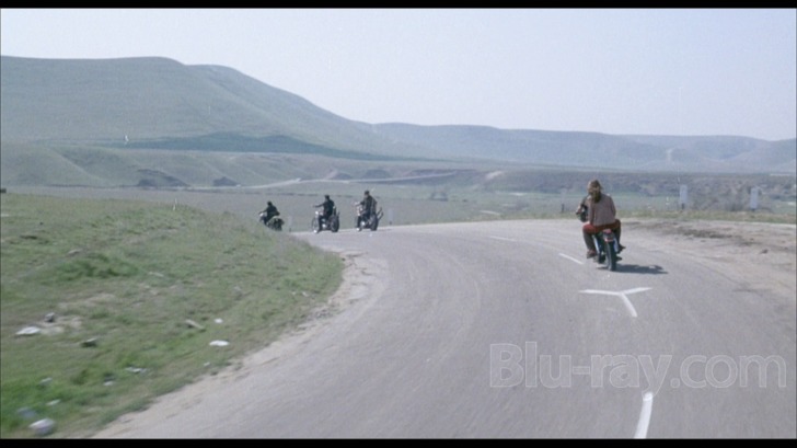 Although it was shot quickly on a low budget, Hells Angels on Wheels has a careful and deliberate visual design. Rush said that he wanted the towns to be neat and orderly and the landscapes to be beautiful, so that the Hells Angels would look like "litter". While not without its issues, the 1080p, AVC-encoded Blu-ray from specialty publisher Hen's Tooth Video presents the the late László Kovács' photography in a form closer to the original intention than has likely been seen since the film first played in theaters. The source element is in decent condition, though it has some flaws. For the first few minutes, two thin vertical black lines run closely together down the right side of the screen. They are more or less visible, and sometimes disappear altogether, depending on what is "behind" them. Then they vanish for good. Small scratches and print knicks appear throughout the film, but most only last for a single frame, and the eye doesn't detect them in playback; they only become evident if you go frame-by-frame. All in all, given the typical handling of film elements by studios, let alone independent distributors, in the era before home video, it is amazing to find Hells Angels on Wheels in such good condition. The image is soft but detailed, with a reasonably fine grain structure that does not appear to have fallen victim to inappropriate electronic manipulation. Long shots frequently appear to be blurry, but one has to recall that Kovács was acting as both camera operator and focus puller, and he was frequently anticipating an object in the foreground. A good example occurs in the wedding scene, where the minister and the makeshift "aisle" creating by the Angels and their bikes are slightly out of focus, because Kovács is clearly prepared for the bride and groom who he knows will enter the shot immediately in front of him. Colors are vivid, so that the green grass Rush wanted to emphasize is very green, and the outfits that scream "Sixties!" do so in all their pink and purple glory. The blacks that are so crucial to capturing the Angels garb (especially Buddy's) are well-represented, and the image, while bright, never appears to have too much contrast. With limited extras, the 95-minute film fits on a BD-25 with an average bitrate of 25 Mbps, which is enough to handle the lively fight scenes in between the quiet conversations.