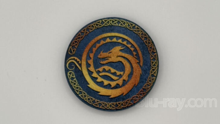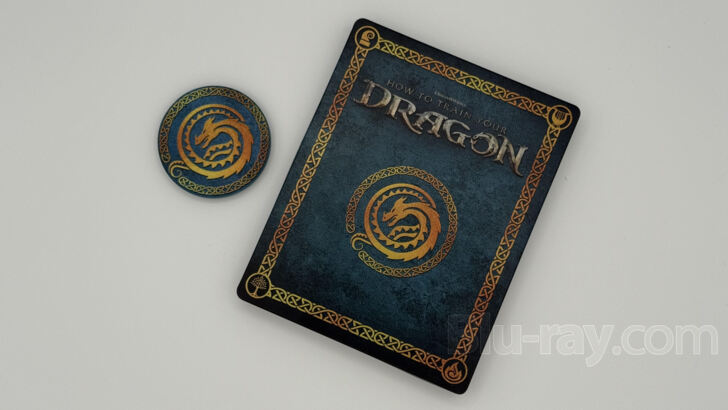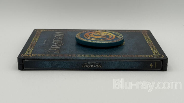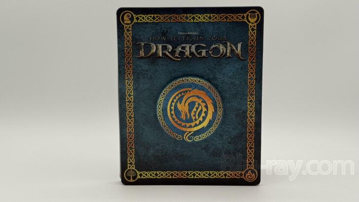 Considering how busy and complex the film and its numerous dragons are, the new How o Train Your Dragon 4K Limited Edition SteelBook with Collectable Magnetic Medallion goes for much simpler look. The SteelBook is designed to look similar in style to the film's all-important Book of Dragons, except here, the cover, spine, and back are a mottled teal. A stylized gold border surrounds the front. In each corner is small circle in which is found a different stylized drawing. A wave is found in the top-left, a lyre in the top-right, fire is in the lower right, and the Viking tree of life, or Yggdrasil, is found in the lower left corner. The film's title is near the top in gold and silver letters. The middle of the cover is dominated by the magnetic medallion which features an embossed stylized dragon in gold and orange which is encircled by the same design that surrounds the cover. Removing the medallion reveals the identical graphic below. The spine features the film's title in the same font as is found on the cover with Universal's logo at the bottom. The back of the SteelBook looks like the back cover of a book. It's free from any design or border. Universal and DreamWorks' logos are centered at the bottom and a product number is found in the lower right. Opening the SteelBook, the Digital Code resides under the two tabs on the left side. On the right side, the 4K UHD disc and the Blu-ray disc are stagger-stacked, each on its own hub, with the 4K UHD disc on top. Removing the discs and the Digital Code reveals a two-panel image Hiccup reaching out to touch Toothless' muzzle as the pair stand atop a rocky peak. They are rendered in silhouette, and the rocks are highlighted in an orange glow that could either be from the first rays sunrise, the last rays of sunset, or more thematically, the result of dragon fire. The SteelBook features a matte finish which should resist fingerprints associated with normal handling. While the overall design may simple, it's absolutely fitting and appropriate for the film.