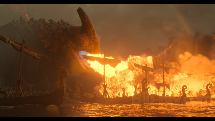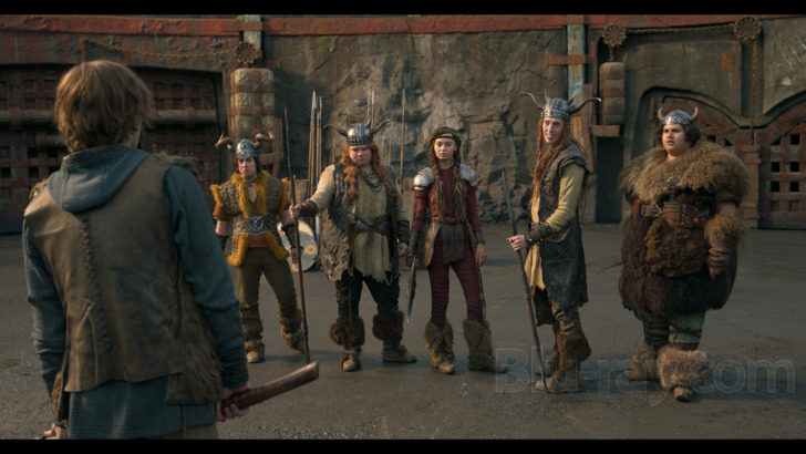 Among the various familiar faces and names involved with this production, John Powell returns to rework his tremendous score from the original film for this live-action translation. The Dolby Atmos track works very hard to showcase the emotional music in every context, whether subtly adding an emotional underscore to scenes such as when Hiccup and his father discuss his participation in training, or more dramatic moments such as the opening dragon attack, when the score is pushed to the forefront. Instrumentation is precise, strings are delicate, and bass is substantial and adds rich depth. Dialogue is kept front and center. Regardless of the occasional bursts of dragon-related mayhem and destruction, each word is understandable under all circumstances. Sounds move freely and frequently throughout the sound field, as dragons soar overhead and race from side to side. Projectiles and debris fly from the rears to the fronts (and vice versa) with excellent realism and fluidity. Even something as simple as Gobber's (Nick Frost) prosthetic leg, faintly click-clacking from the front of the sound field to the rear as he exits the arena after the first training session, is delightful and is but one example of many such instances of the myriad sound elements that make the track so wonderfully immersive. Sound effects are impressive throughout, whether they be mundane sounds such as dropping heavy books on a table and clanking mugs, or more impressive sounds such as dragon roars and growls, and the bass-heavy, destructive rampage of the film's kaiju-scale final foe.