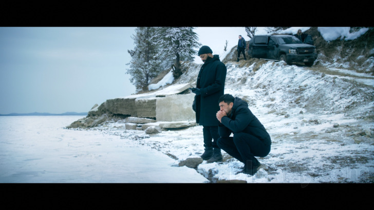 The image presentation (2.39:1 aspect ratio) for "Icefall" handles details adequately. There's a mild sense of texture on skin surfaces, especially when exploring differences in age. Cold weather clothing maintains fibrousness, along with tribal outfits. The stagebound look of the endeavor is mostly easy to explore, offering dimension with frozen lake events. Authentic location shooting carries acceptable depth, joined by cave exploration. Color is capable, sustaining sharper winter whiteness and blue skies and waters. Costuming delivers varied hues, including the deep greens of the game warden uniform and the livelier primaries of Native American ceremonial additions. Skin tones are natural. Delineation is acceptable. Compression issues are periodic, with banding creeping into view. Mild blockiness is found as well.