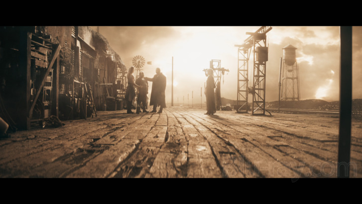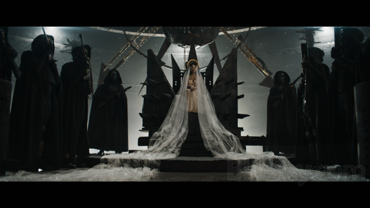 Detailed above, the ambitious but hardly original visual design of In the Lost Lands fares mostly well on Blu-ray from Vertical Entertainment, as the majority of this 1080p transfer has no real problem translating its near-monochromatic scenes and purposely boosted contrast levels. Fine detail is unsurprisingly hit-or-miss, partially due to these intentional decisions but also because of its somewhat waxy digital origins. The same goes for textures and color saturation is also up in the air, seemingly represented well under the circumstances but never given a chance to shine by design. I was actually tempted to give this Blu-ray stronger marks since it seems like a solid transfer overall and runs at a decently supportive bit rate on this single layered-disc (which is more than enough real estate for a 2.39:1 film with little color and no bonus features), but banding rears its ugly head on several occasions, even the very first scene as shown in screenshot #6. This defect isn't exactly a deal-breaker, of course, and much of the time it's partially masked by the film's intentionally skewed design, but it's well worth noting and could have been handled better.
