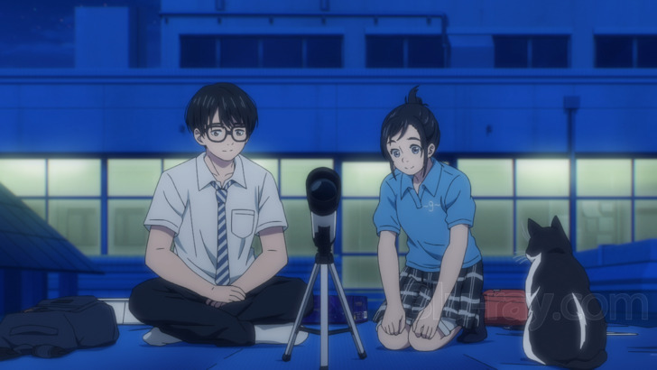 Released on Blu-ray by Sentai Filmworks, Insomniacs After School is presented in 1080p MPEG-4 AVC encoded high- definition in the original television broadcast aspect ratio of 1.78:1 widescreen. The high-definition presentation is exceptional on the release. The presentation showcases the animation at its finest with great color reproduction and overall clarity on the encoding. The background art looks so warm and inviting – the night skies look terrific and far more visually immersive than even expected. Colors are beautiful. The artistry is well showcased on the release with such a stunning and clear presentation. The reissue is entitled as "Insomniacs after School – New English Dub Collection" – containing a similarly pleasing (and likely identical) video encode to the previous edition (which contained only the Japanese language version).