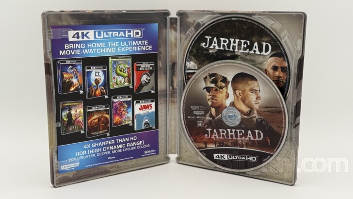 Based on the book of the same name by former Marine Corps Scout Sniper Anthony Swofford, 'Jarhead (2005)' makes its way to 4K UHD disc in this 'Jarhead: 20th Anniversary Limited Edition SteelBook 4K' courtesy of Universal. The film tells of Swofford's experiences during Operation Desert Storm and stars Jake Gyllenhaal ('Source Code') as Anthony Swofford, a young man who wasn't exactly thrilled with enlisting, Jamie Foxx as Staff Sergeant Sykes ('Ray'), and Peter Sarsgaard (Troy, 'Garden State'). This release brings forward a host of extras that have been absent since the DVD/HD-DVD era, though no new on-disc supplemental material has been created. Technical merits are solid, with the release boasting an eye- catching 2160p presentation and an efficient Dolby Atmos track. A Blu-ray disc, and a Digital Code redeemable via Movies Anywhere are also included. Please scroll down to the 'Special Features and Extras' section below for a discussion of the new SteelBook.
