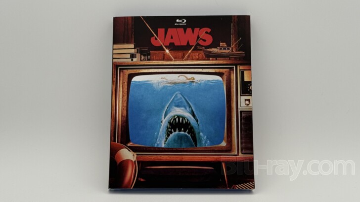 Made to look like a family room from days gone by, a vintage console television dominates the middle of the slipcover. On the screen the classic poster art for the film is displayed, with the massive shark rising up directly beneath the lone female swimmer, it's toothy jaws open. On top the television, a model ship sits on the right, while a stack of VHS tapes sits on the left. A life preserver ring sits on the floor and leans against the lower left-hand corner of the television set. The films title, printed in large red block letters, is centered above the television set in a field of black. The letters are behind the shimmering, gold rabbit-ear antennae that perch on top of the set. That shimmering effect is created by a gold foil accent that also covers the beveled edge of the television screen's frame and other metallic elements of the housing for the set's various dials and knobs. The spines are simply home to the film's title in red block letters centered in a field of black. The Blu-ray logo is the top, while Universal's logo is at the bottom. The reverse image captures much, but not all, of the information from the back of the case's insert and shares the same stills from the film.