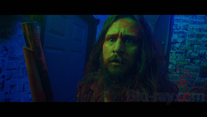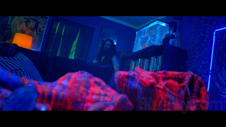 increasingly goopy violence. The production elects to use an extreme look for the picture, which blasts viewers with color, often favoring blacklight hues